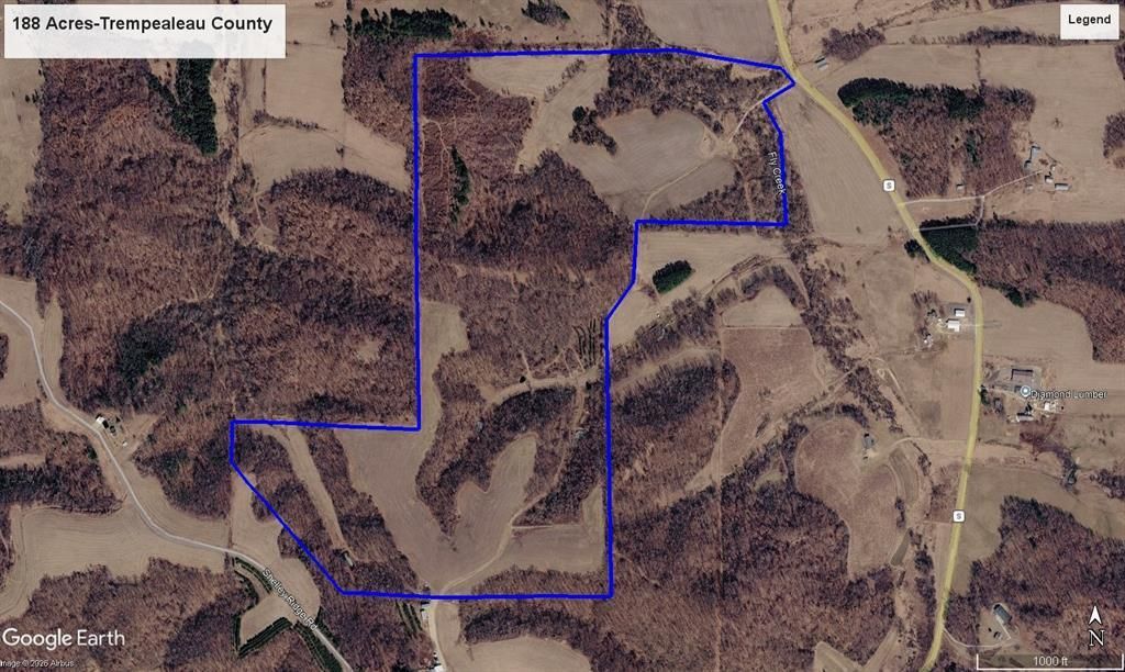 A unique and incredible farm awaits you in the heart of Trempealeau County. This 188 acres stands as a trophy deer manager's dream. Featuring a vast ridge system with rolling bluffs, numerous natural springs, and 55 tillable acres. This property checks all boxes for a legacy farm. Featuring excellent beddings areas, an elaborate trail system, established food plots, multiple build sites and views of the countryside that have to be seen to be appreciated. Fly Creek flows through the property providing a year-round water source and excellent habitat for wildlife. An exterior 8' tall fence runs the Northern and Westerly property lines. This fence has enabled the seller to better manage the free range deer herd, as well as a 110 acre enclosure that is licensed as a deer farm. This is an incredible property in a fantastic area of Trempealeau County.