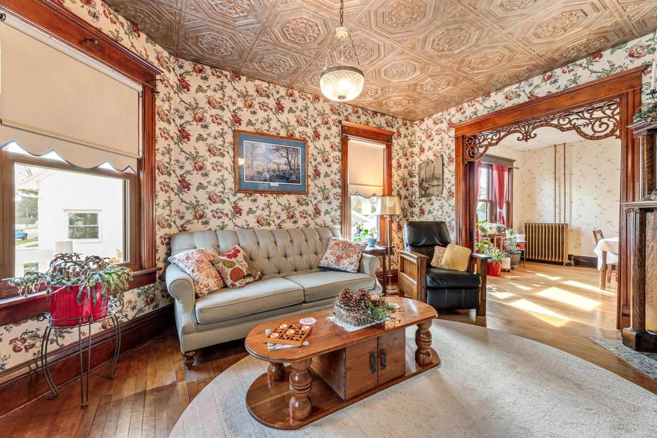 Step into timeless charm with this beautifully maintained 1905 home full of character! You'll love the natural woodwork, open staircase, and stunning original hardwood floors. The main level offers a convenient primary suite, main floor laundry, and cozy living spaces, including a welcoming parlor and fireplace. Thoughtful updates--newer windows and electrical--blend modern comfort with classic style. Upstairs features four spacious bedrooms and an updated bath, including one bedroom with access to a private deck--perfect for morning coffee or evening relaxation. Outside, enjoy a 3+ car heated garage, new concrete, firepit, gardens, and a covered front porch with composite decking. With great storage and unmatched charm, this home is truly one-of-a-kind!