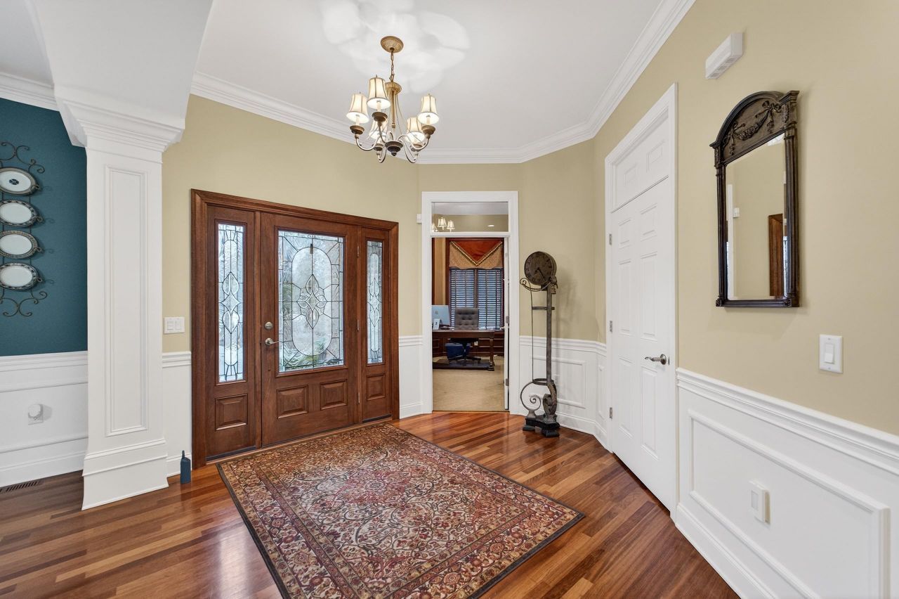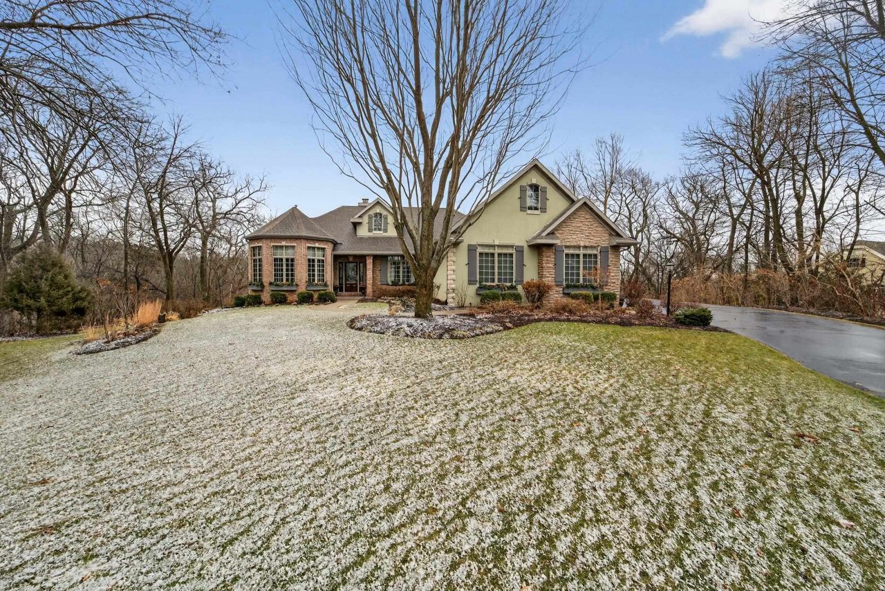 Nestled on a beautifully private lot overlooking serene greenbelt, this custom-built Parade Home showcases timeless design and exceptional craftsmanship. Brazilian cherry floors span the main level, where a stunning kitchen flows into the inviting hearth room and dining area, with access to the three-season porch for enjoying the natural surroundings. Architectural details include extensive crown molding, custom built-ins, coffered ceilings, and a double tray ceiling in the primary suite. Nine-foot ceilings on both floors (except office). The main level offers two bedroom suites for ideal guest or multigenerational living. The primary suite features expansive windows and a spa-like bath with radiant heated floors. Two gas fireplaces add warmth and ambiance. The finished lower level offers generous living space plus additional bedrooms and bath. Immaculate and move-in ready, blending luxury, comfort, and privacy.