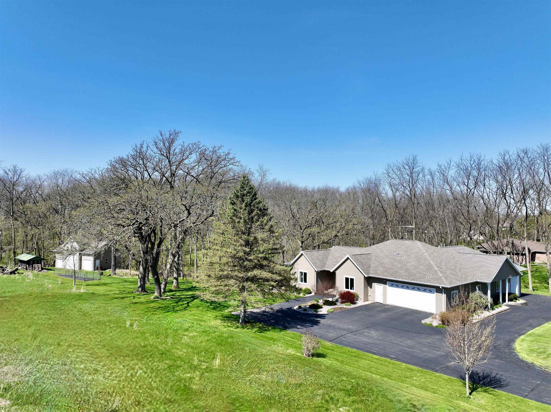 Custom-built ranch on nearly 4 wooded acres just minutes from downtown Janesville?offering a rare blend of privacy, quality, and versatility. This 3+ bedroom, 4 bath home features 9' ceilings, maple hardwood floors, a remodeled kitchen with hickory cabinetry and quartz counter tops, and a beautifully updated primary suite. Enjoy a bright finished lower level, expansive 3-season room, and large deck overlooking private trails and abundant wildlife. Ideal for hobbyists or entrepreneurs with a heated attached workshop, separate office with private entrance, and a second heated outbuilding with loft storage and high-clearance space. Ample paved parking for equipment, trailers, or guests. Milton Schools. A truly unique live-work-lifestyle opportunity.