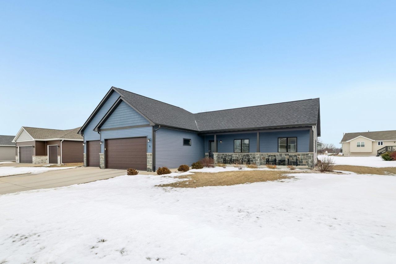 Located minutes from the Evansville Aquatic Center, parks, and walking paths, this move-in-ready home offers modern comfort in a desirable neighborhood. Built in 2018, this well-designed ranch home offers 5 bedrooms, 3 full bathrooms, and a 3-car garage. The open-concept kitchen features quartz countertops and LVP flooring, flowing seamlessly into the great room with a cathedral ceiling and cozy gas fireplace. Enjoy easy main-level living, including a spacious primary suite w/ a private en suite featuring a tile shower and a walk-in closet, along with a laundry area conveniently located in the main floor mudroom, complete with built-in storage lockers. Step outside from the dining area to a deck overlooking the backyard, perfect for entertaining, with a concrete patio below for additional outdoor living space. The large finished lower level with 9ft ceilings adds 2 bedrooms, a full bathroom, a generous rec room, and two storage rooms. Roof replaced in 2025.