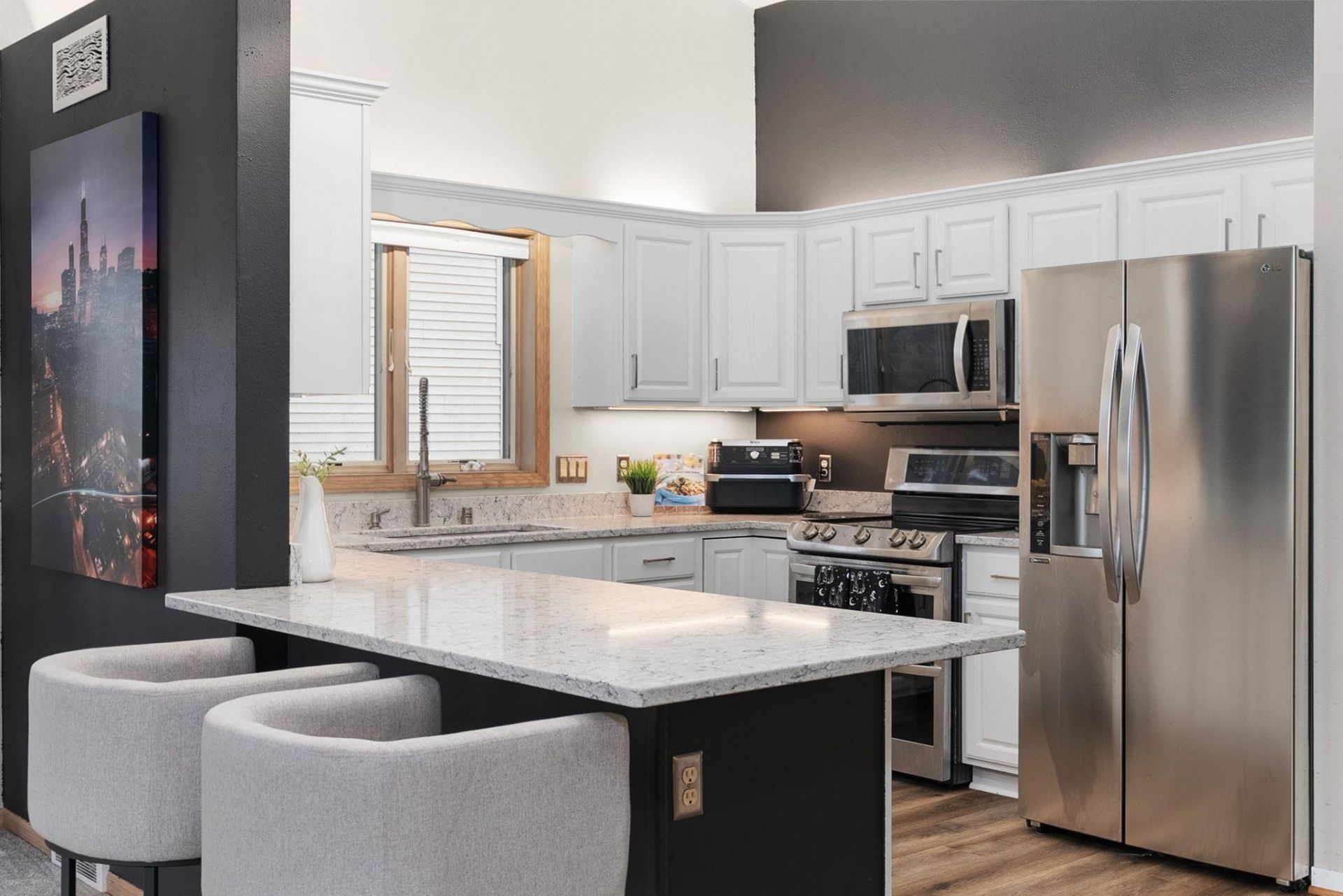 Ranch-style half duplex in the desirable Richmond Hills neighborhood! This legally established condominium has no active association or condo fees. Featuring an open-concept layout with vaulted ceilings, a split 2-bedroom design, and 2 full bathrooms on the main level. The updated kitchen offers quartz countertops, stainless steel appliances, and an optional washer/dryer hookup in the pantry. The living room boasts a cozy gas fireplace and overlooks Richmond Hill Park. The finished lower level includes a spacious family room, half bath, and den/office?perfect for work or relaxation. Enjoy low-maintenance living in a prime location!