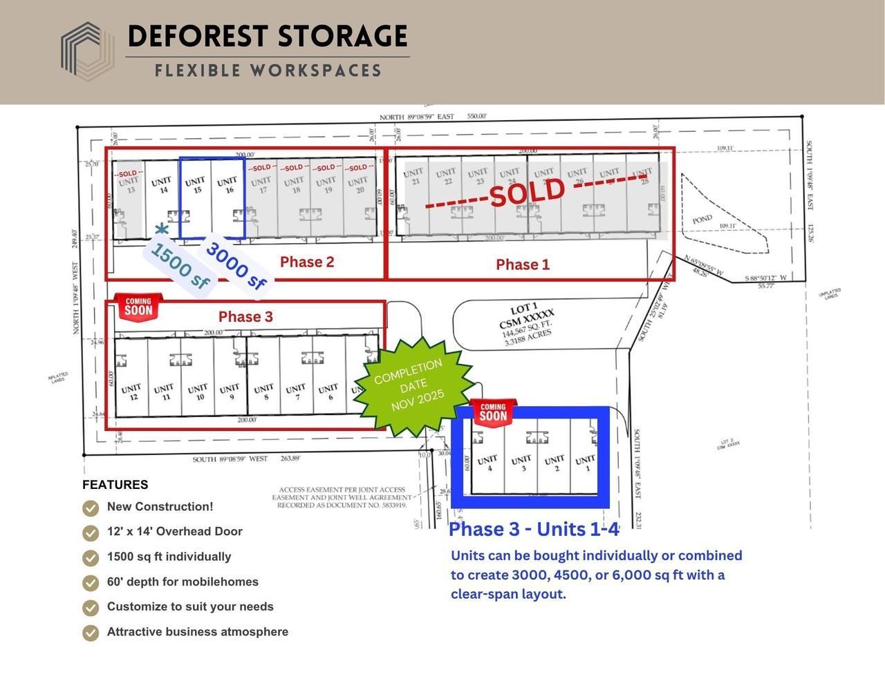 Completion Date: 01/31/26. Sought-after storage/workspace condos are now available in Windsor-DeForest (Phases 3 & 4)! Each spacious 1,500 SF unit (60' deep) offers the perfect solution for small business owners, contractors, hobbyists, or RV/boat enthusiasts looking for a secure and flexible space. High-quality construction includes LP SmartSide exterior, a 12? x 14? motorized overhead door, and insulated walls. Customize your unit with optional office, bathroom, or mezzanine build-outs. Need more space? Combine units for up to 4,500 SF. A low $100/month condo fee per unit covers exterior maintenance, snow removal, and insurance. Rare opportunity to own premium, adaptable space in a growing area.