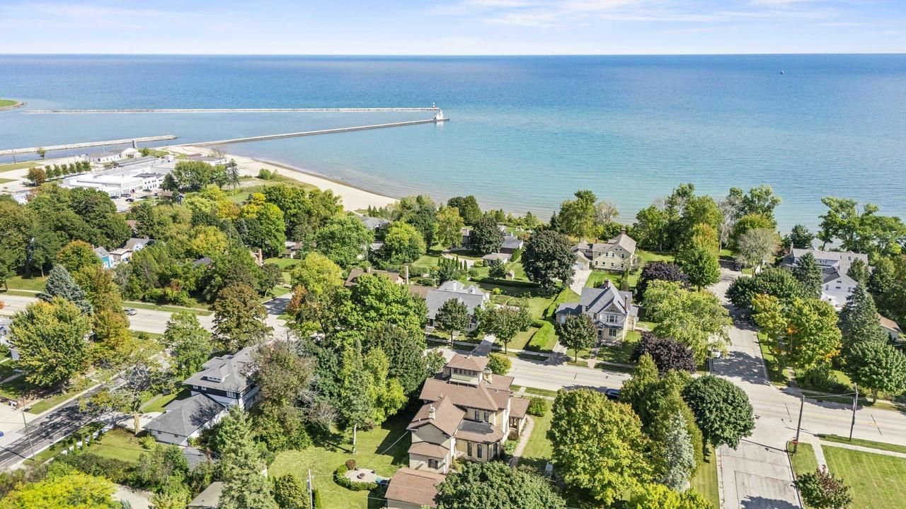 Wow! The character, the space, the views of Lake Michigan make this house a must-see! South front door opens into original house with dining room, living room, den and kitchen & is attached to 26"x14" addition which was used for a business and has 10 individual rooms. Upper level has 5 bedrooms and two full baths?the primary suite and 20x15 bedroom were additions along with spectacular sunroom offering views of Lake Michigan. LL is spotless with two enormous rooms for entertaining, as well as individual rooms for various hobbies and activities. There are two staircases to access both upper and lower levels. Back-entry room connects house to two-car garage. Hot water heat. Spacious lot with beautiful landscaping bursting w/colorful flowers throughout growing season and views of the Lake.