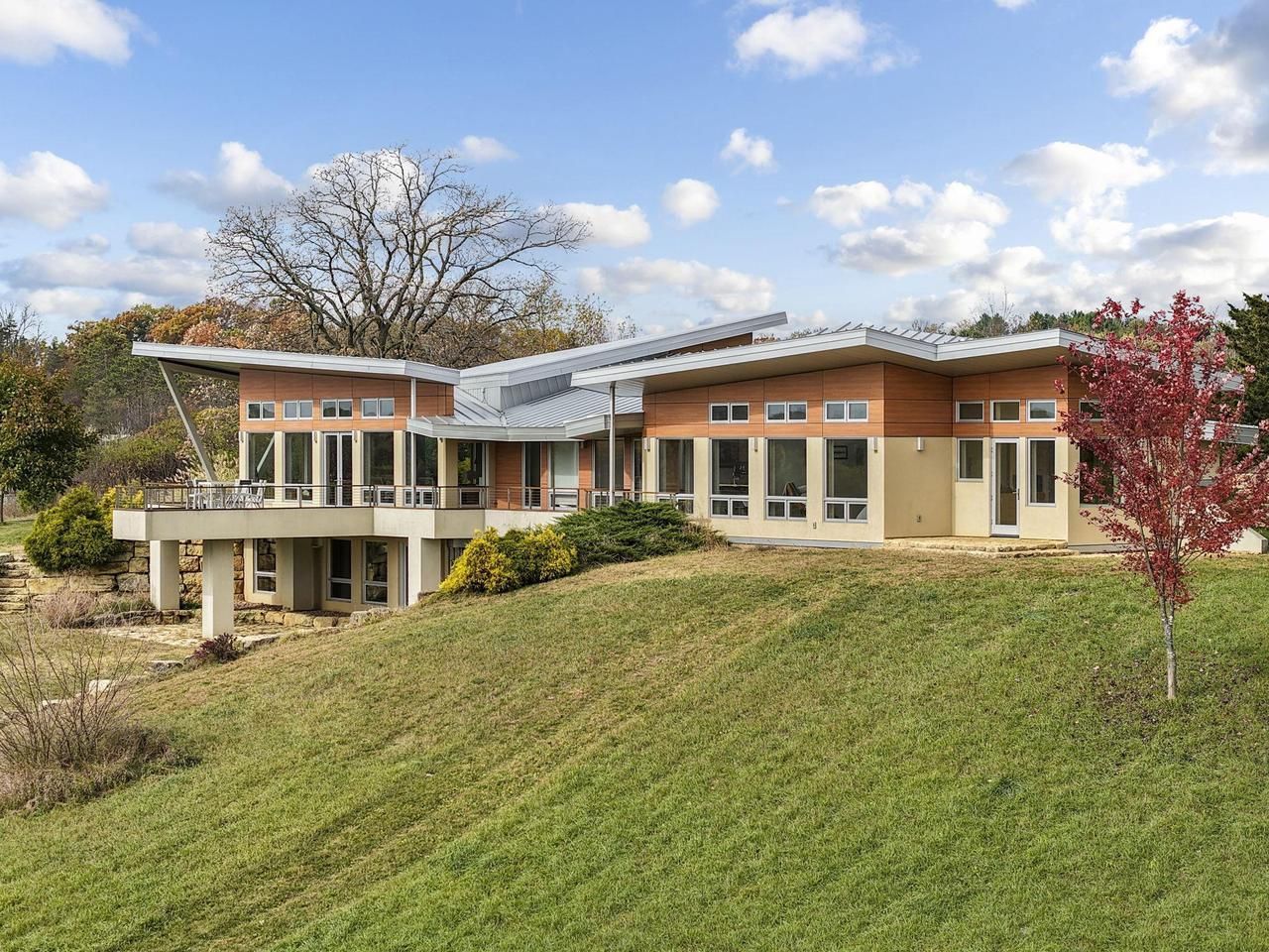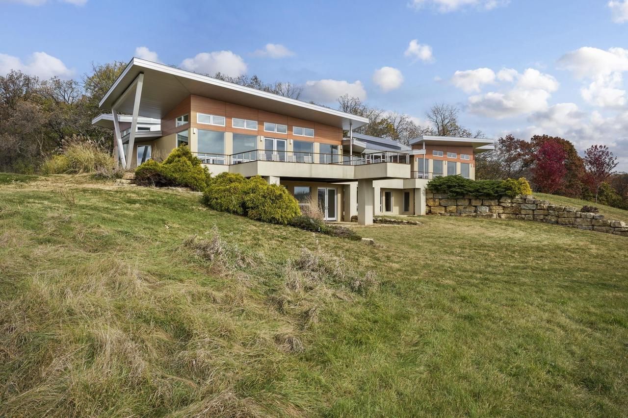 Frank Lloyd Wright meets Frank Gehry in this stunning fusion of midcentury modern and contemporary design. This south-facing, hilltop property is set on 15.5 acres with 3 acres of mature woods and breathtaking Driftless views. This custom masterpiece must be seen to be believed. The expansive Great Room anchors the home, complemented by a chefs kitchen with Subzero/Wolf appliances, quartz countertops, cork floors, and touchless faucets. Built sustainably with Ecoclad siding, SIPs construction, and a Brazilian Ipe deck. Features include whole-house 7-zone audio, Paradigm 5.1 surround sound, passive heating/cooling, 9-zone radiant floors, a 4-ton geothermal system, and Loewen triple-pane window, HVAC costs only $1,500/year. Bring your own ideas. Finishing LL would add 1800 sqft, 2 beds/2 baths finished plus family & flex room. https://8680messerschmidtdrive.com