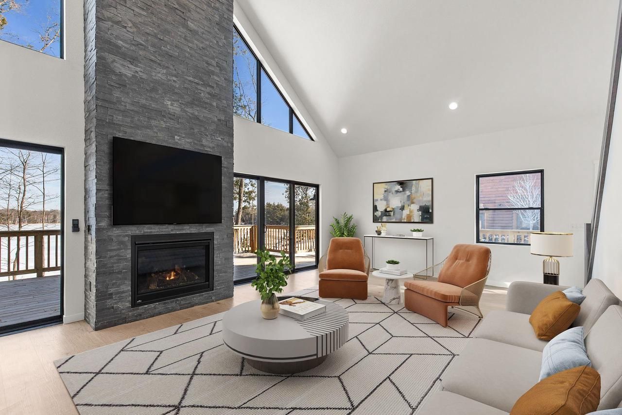 Welcome to this extraordinarily custom-built 2025 lakefront home on Legend Lake, offering 100 ft of sandy frontage. This stylish 5-bd, 3-ba year-round retreat features an open-concept design with floor-to-ceiling windows & a stunning gas fireplace showcasing panoramic lake views. Enjoy the heated 3-season room with vertical track window system for extended outdoor living. Set on .60 wooded acres at the end of a quiet road, the property offers privacy and serenity. An oversized garage fits vehicles and a boat, plus convenient first-floor laundry. Luxury, comfort, and lake life perfectly combined. Schedule your showing today & you can be settled into this home and taking in all it has to offer in time to enjoy spring and summer!